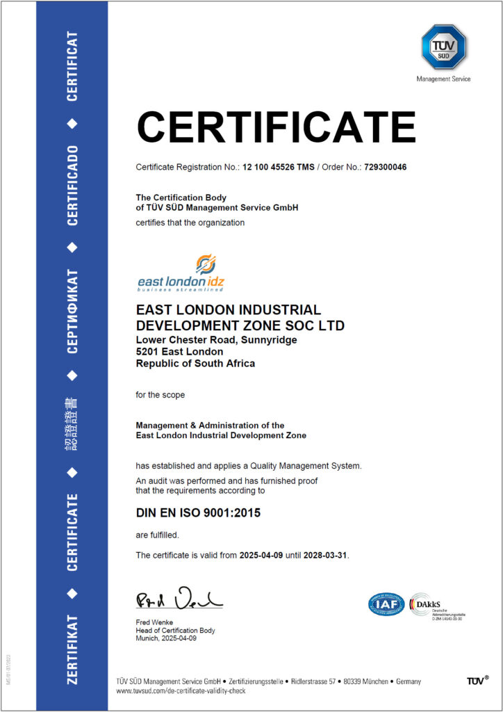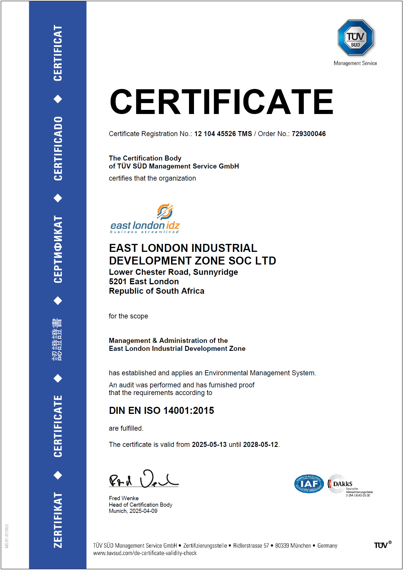 The ELIDZ recognizes that Operational Health and Safety Management (OH&S), Environmental Management and applying Quality Management Systems’ (QMS) best practices within its Special Economic Zone precinct is key to ensure that its management and operations remain aligned to international standards as this is an integral part of its overall business performance.